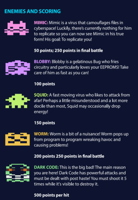 The download link comes with game manual and both PAL & NTSC versions. (Both in .bin and .a26 format) Some returning enemies from the original Cyber Run game are featured here plus some new faces to the universe!